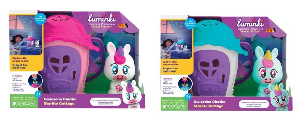 Magiczna lampka nocna, która rozświetla dziecięce sny. Sprawia radość i buduje poczucie bezpieczeństwa, rozwija zmysły. Chatka emituje delikatne światło, wydaje słodkie dźwięki i wyświetla nocne niebo pełne gwiazd. Gdy pocałujesz Luminka, który mieszka w chatce, jego główka zaczyna świecić wystarczy sam odgłos cmoknięcia. Lampka wyłącza się automatycznie po 10 minutach.