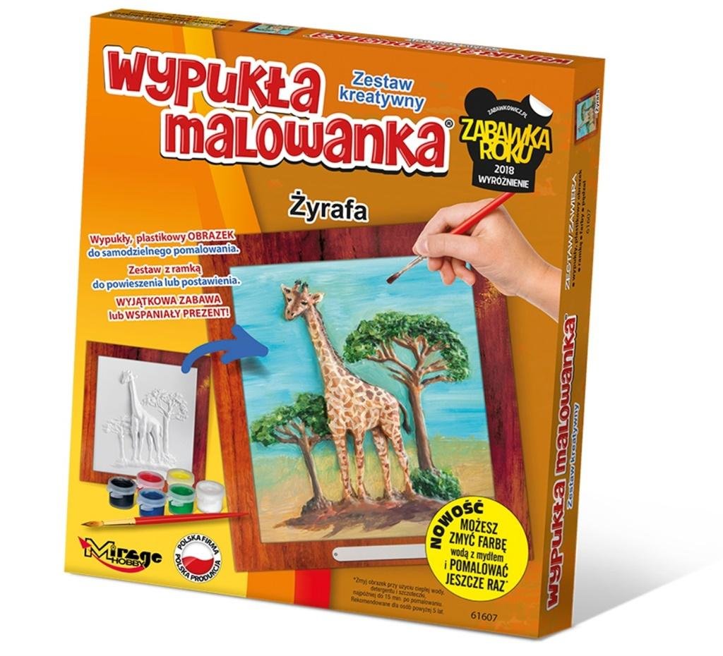 Wypukła Malowanka od Mirage Hobby to Zestaw Kreatywny dla osób powyżej 5. roku życia. Zestaw zawiera wypukły, plastikowy, kształtny obrazek, farbki akrylowe, pędzelek oraz ramkę z kartonu do postawienia lub powieszenia. Zmyj obrazek przy użyciu ciepłej wody, mydła i szczoteczki, najpóźniej do 15...