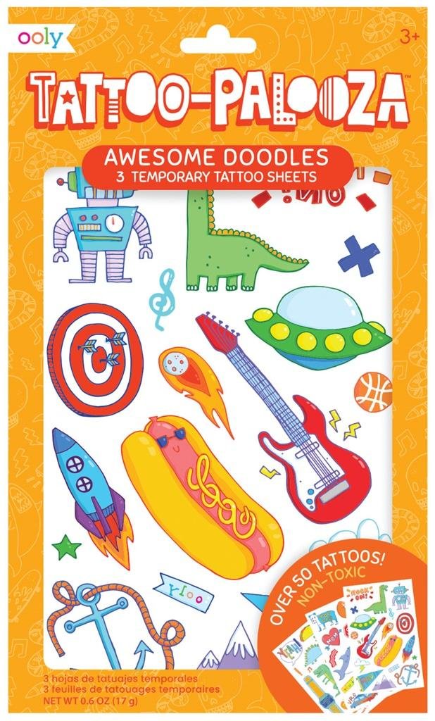 Ooly Tattoo Palooza to ponad 50 kolorowych, wesołych tatuaży dla dzieci zebranych na 3 arkuszach 13x21cm każdy. Łatwe w użyciu i całkowicie zmywalne.Tęczowe, energetyczne a momentami bardzo magiczne, pełne pozytywnej energii tatuaże w wersji całkowicie zmywalnej, dla najmłodszych zwolenników...