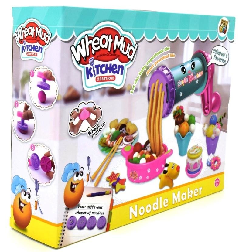 Maszynka do makaronu z masy plastycznej dostarczy kreatywnej zabawy. Zestaw utrzymany jest w radosnych barwach, a 4 rodzaje sitek i 5 kolorów masy pozwala stworzyć niesamowite plastyczne makarony. Do maszynki dołączono również naczynia, sztućce oraz pieczątki i foremki.