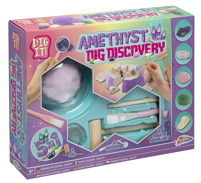 Vykopej 5 drahokamů, ale dej pozor, ať je nepoškodíš!! Opatrně pomocí dláta a paličky vykopávej drahokami, očisti štětečkem a pak si z nich můžeš udělát přívěsky pmcí šňůrek, které najdeš v balení. Balení obsahuje: 5 zalisovancýh drahokamů, dláto, paličku, štětec a šńůrky na pověšení na krk. przeczytaj całość