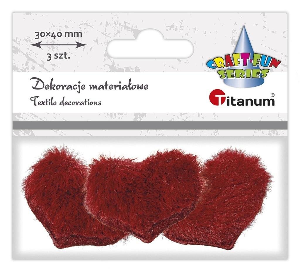 Aplikacje materiałowe. Wzór: serca futerkowe, wymiary: 40 x 30 mm, kolor: czerwone, grubość wypełnienia 10 mm. 3 sztuki. przeczytaj całość