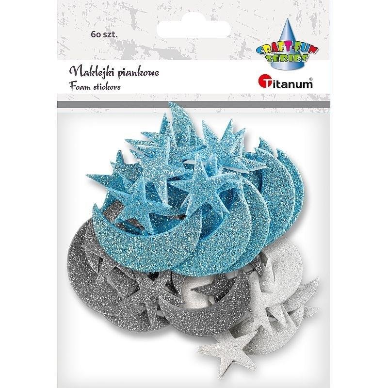 Naklejki piankowe brokatowe księżyce 15x42/12x35mm, gwiazdy 21x21mm niebieskie, srebrne, białe 60szt. przeczytaj całość