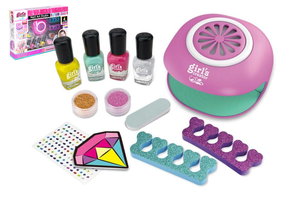Tvorba nehtů s vysoušečemSoučástí vysoušeč, 4 barevné laky, třpytky, pilník, ozdoby a další. Světelné efekty vysoušeče. 2xAA baterie do vysoušeče nejsou součástí. Obrázkový návod na zadní straně obalu. przeczytaj całość