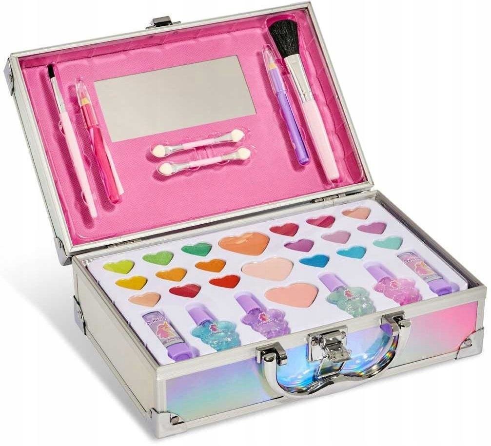 Zestaw kosmetyków dla dzieci w walizce zawiera:18 cieni do powiek,4 brokatowe lakiery,3 róże i brązery,2 błyszczyki. przeczytaj całość