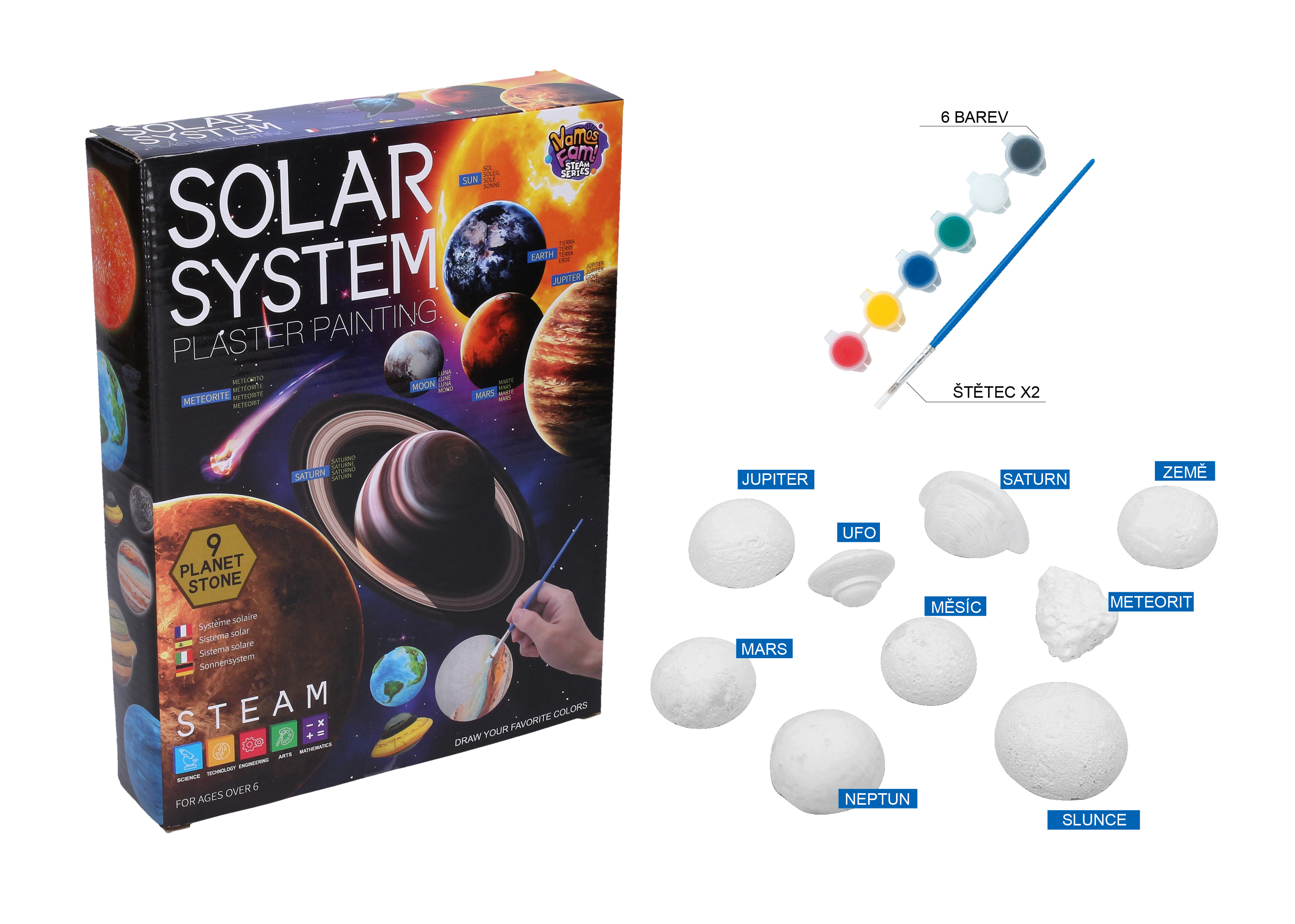Sluneční soustava - malování. Součástí model Země, Mars, Jupiter, Saturn, Neptun, Slunce, Měsíc, meteorit, UFO, 2 štětce, barvy, návod jak míchat vzájemně barvy na zadní straně obalu. Velikost modelů 4 až 5 cm. przeczytaj całość