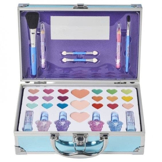 Zestaw kosmetyków dla dzieci zawiera 18 cieni do powiek, 4 lakiery do paznokci, 3 bronzery i róże , 2 szminki, 1 pędzel do różu, 1 pędzel do bronzera i 2 aplikatory. przeczytaj całość
