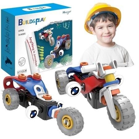 Młody Inżynier - Motocykle 37 elementów.Zestaw zawiera:elementy do zbudowania pojazdów,narzędzia do zmontowania pojazdów (śrubokręt, klucz, śrubki),instrukcja obrazkowa. przeczytaj całość