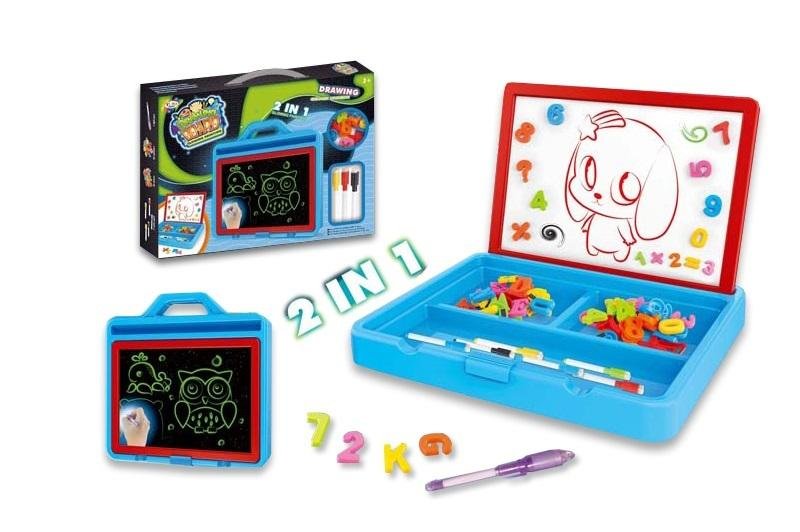 W zestawie: dwustronna tablica, podstawka na tablicę i przybory, świecący długopis, 5 kolorowych pisaków z gąbką do ścierania, 26 magnetycznych literek, 26 magnetycznych cyferek, funkcje: na jednej stronie można malować ścieralnymi pisakami, druga strona jest pokryta powłoką luminescencyjną, która pozwala na malowanie w ciemności, wym. Opk: 44 x 32,5 x 4,5 cm., Baterie: 3 x ag13 załączone demonstracyjne 3+