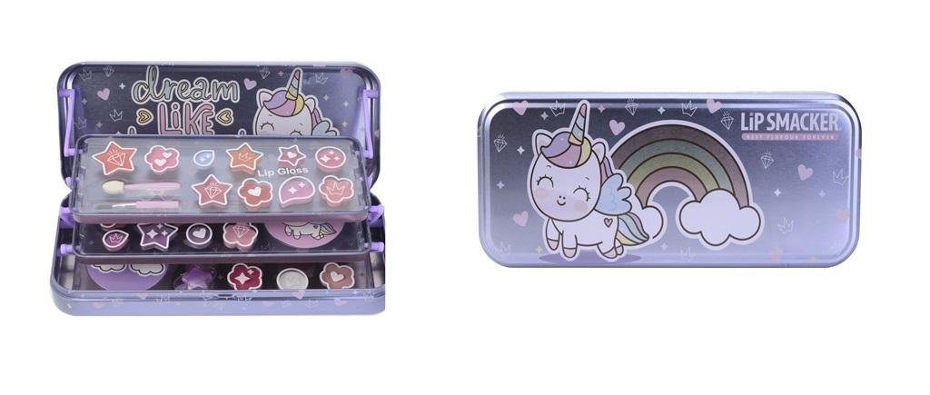 Trzypozionowa puszka zawiera:1 blaszana puszka,16 błyszczyków do ust,8 kremowych cieni do powiek,2 aplikatory,2 aplikatory,2 naklejki. przeczytaj całość