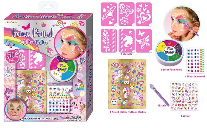 Ten zestaw do malowania twarzy zawiera wszystko, co niezbędne do wesołej i kreatywnej zabawy. Dzięki brokatowym tatuażom, kolorowym flamastrom do tatuażu, kamyczkom oraz szablonom dzieci mogą ozdabiać nie tylko twarz, ale także włosy i ciało oryginalnymi wzorami. Łatwe nakładanie zapewnia dołączony pędzelek oraz farby delikatne dla dziecięcej skóry. Zestaw jest odpowiedni dla dzieci od 6 lat, co pozwala rozwijać ich twórcze umiejętności od najmłodszych lat. Tworzenie staje się przy tym doskonałą okazją do zabawy i dzielenia się radością z przyjaciółmi i rodziną.