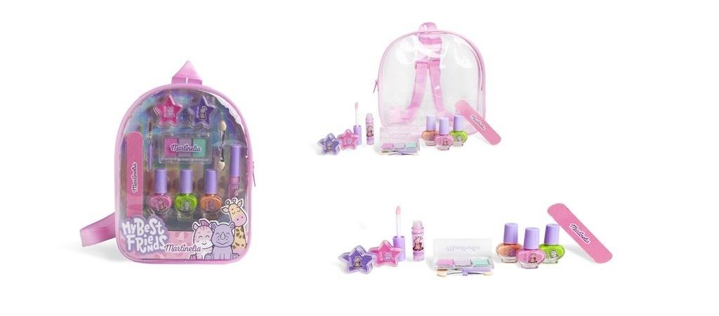 Zestaw kosmetyków dla dzieci w plecaku zawiera: 3 lakiery do paznokci, 1 paleta cieni do powiek (3 odcienie), 3 błyszczyki do ust, 1 pilnik do paznokci, 1 pędzel do ust, 1 aplikator. przeczytaj całość