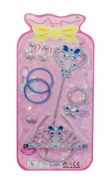 Zestaw biżuterii tiara z różdżką. W zestawie znajduje się także naszyjnik, kolczyki, pierścionek i 2 bransoletki. Wszystko z motywem motyla. Produkt zapakowny w kartonową podstawkę z przezroczystym kloszem. Zabawka dla dzieci od 3 lat. Podane wymiary są wymiarami opakowania. przeczytaj całość