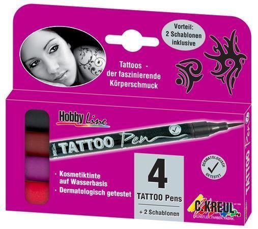 Zestaw pisaków do tatuażu Tattoo Pen 4 szt. Zestaw zawiera: 4 x pisaki do tatuażu - (czarny, henna, czerwony, fioletowy) 2 x szablony (ornamenty) Charakterystyka: Pisaki do tatuażu do modnego malowania na skórze, które wykorzystasz np. na zabawy, karnawały, dziecięce przyjęcia urodzinowe itp. Zawiera kosmetyczny tusz rozcieńczalny wodą. Łatwe użycie dzięki cienkiej końcówce do rysowania. Szerokość linii 0,5 - 3 mm Skórę przed użyciem pisaków należy odtłuścić. Po użyciu dobrze zamknąć, aby pisak nie wysychał.