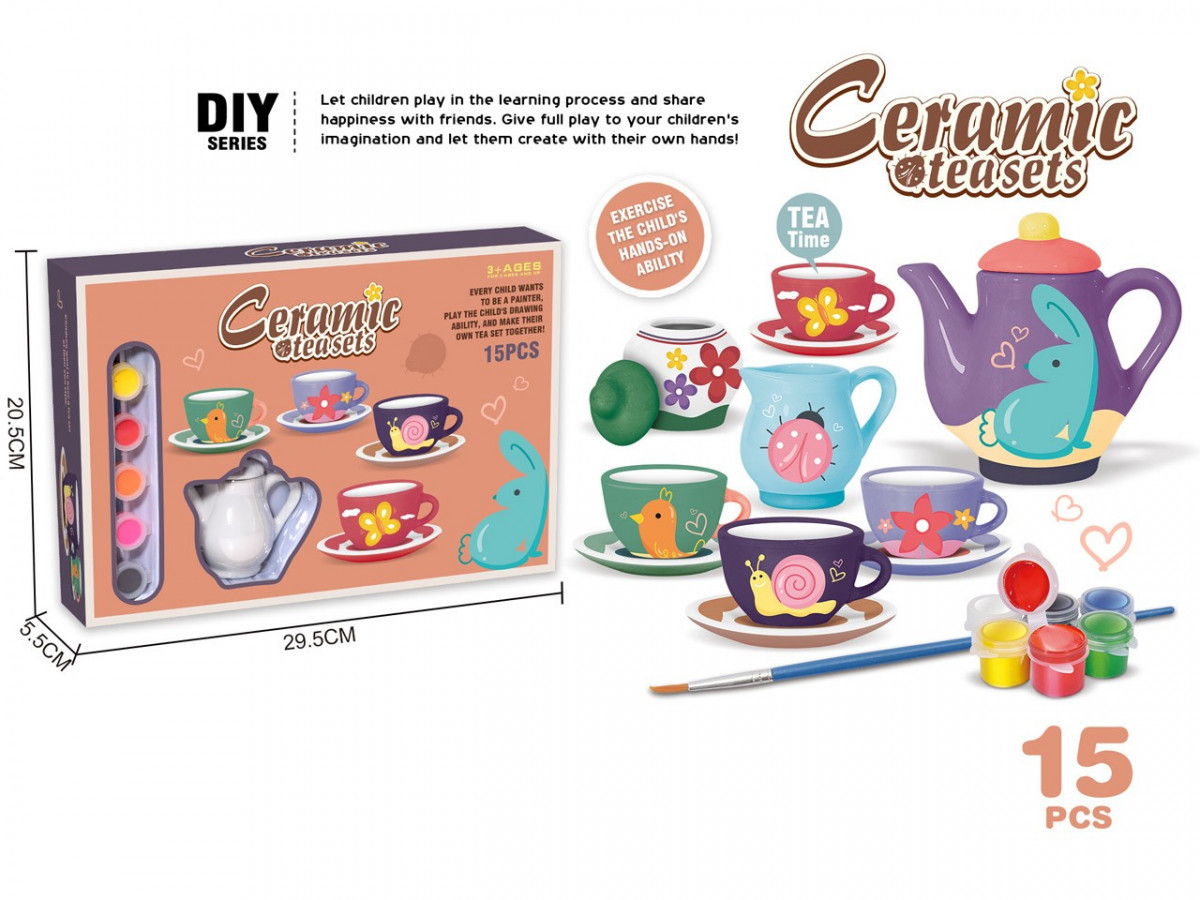 Chcesz zaskoczyć swoje koleżanki super serwisem do herbaty? Wypróbuj ten!Ozdób go i pomaluj według własnego projektu.Zorganizuj mini herbaciane party z ulubionymi lalkami lub udekoruj serwisem swój pokój.W tym zestawie znajdziesz wszystko czego potrzebujesz, by ozdobić 15 częściowy mini serwis do herbaty.To super zabawa! BAW SIĘ I UCZ JEDNOCZEŚNIE!