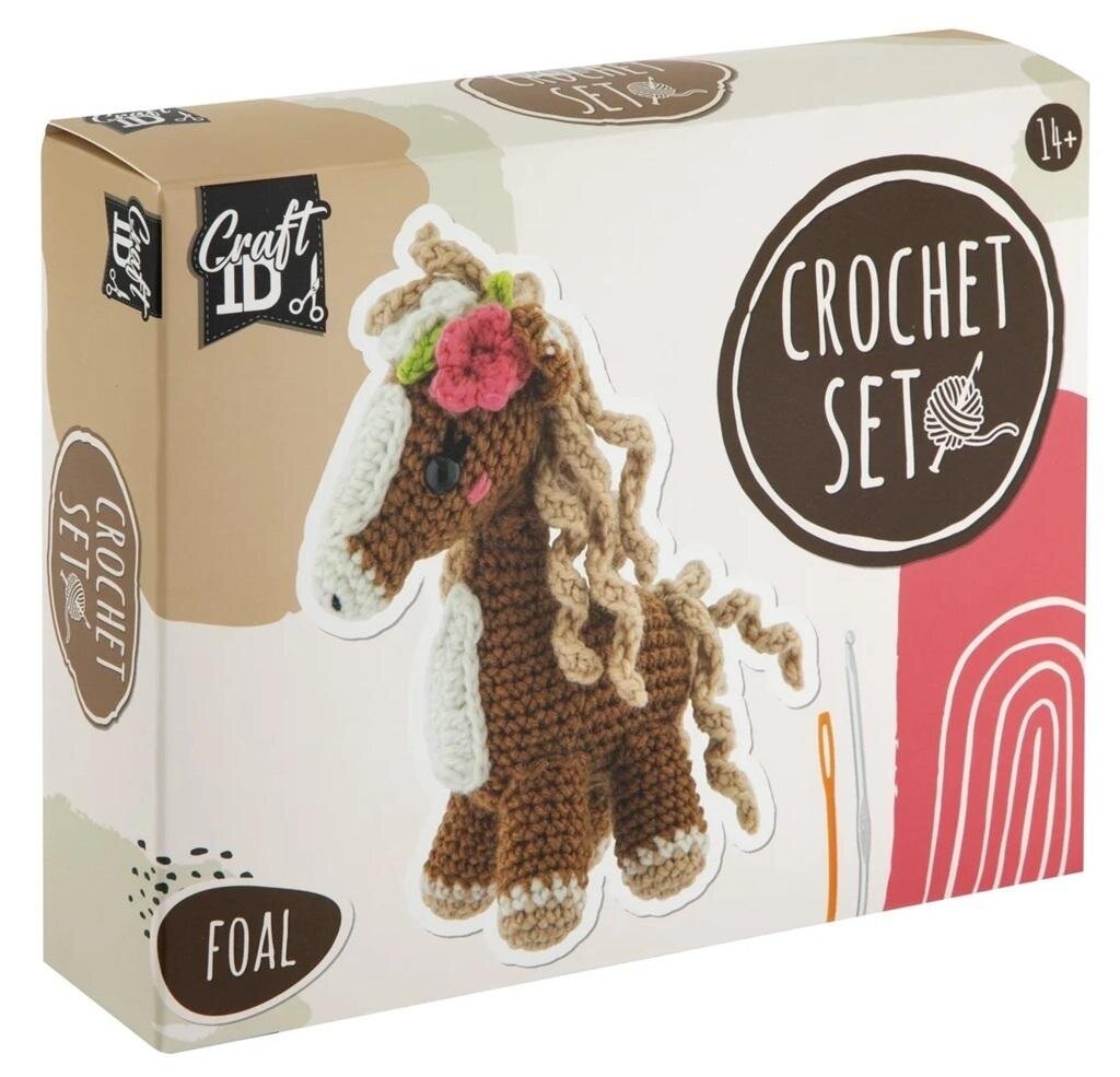 Zestaw do szydełkowania Źrebię 9,5x15,5x16 cm. Zestaw zawiera: nici w kolorze brązu, bieli i beżu, plastikowe szydełko + oczka dla konika przeczytaj całość