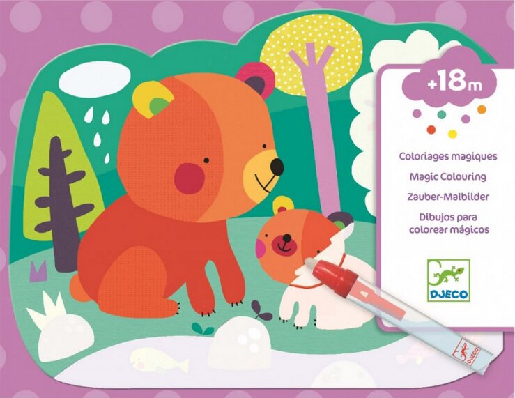 Postacie zwierzątek - misia, kotki, sówki czy liska - na 4 obrazkach o wielkości 21x26 cm pojawiają się dopiero po przetarciu magicznym ołówkiem. Ołówek przed użyciem napełnia się wodą, która umożliwia odkrycie obrazków w wielobarwnych kolorach. Pięknie kolorowy obraz pozostaje odsłonięty, dopóki cała naniesiona woda nie wyparuje. Po wyschnięciu obraz ponownie pokrywa się białą, nieprzezroczystą warstwą i dzieci mogą odkrywać go na nowo. Zabawa bez końca zajmie i zabawi dzieci podczas długich i krótkich podróży.