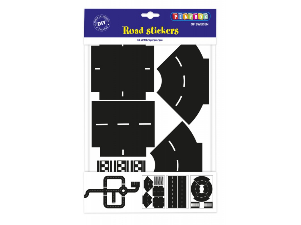 Naklejki dróg, rond, skrzyżowań, przejść dla pieszych i parkingów. Opakowanie zawiera: 50 szt. naklejek dróg - 5 arkuszy długiej dwupasmowej drogi ok. 32 cm - 2 szt. na arkuszu, 1 arkusz krótkiej dwupasmowej drogi ok. 16 cm - 4 szt. na arkuszu, 3 arkusze z przejściami dla pieszych i zakrętami, 2 arkusze ze skrzyżowaniami, 1 arkusz z miejscem parkingowym.