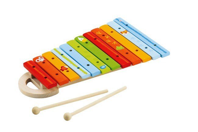 Kolorowy, drewniany ksylofon ze zwierzaczkami i dwoma pałeczkami do uderzania.Wymiary: 30  x 4 x 22 cm przeczytaj całość
