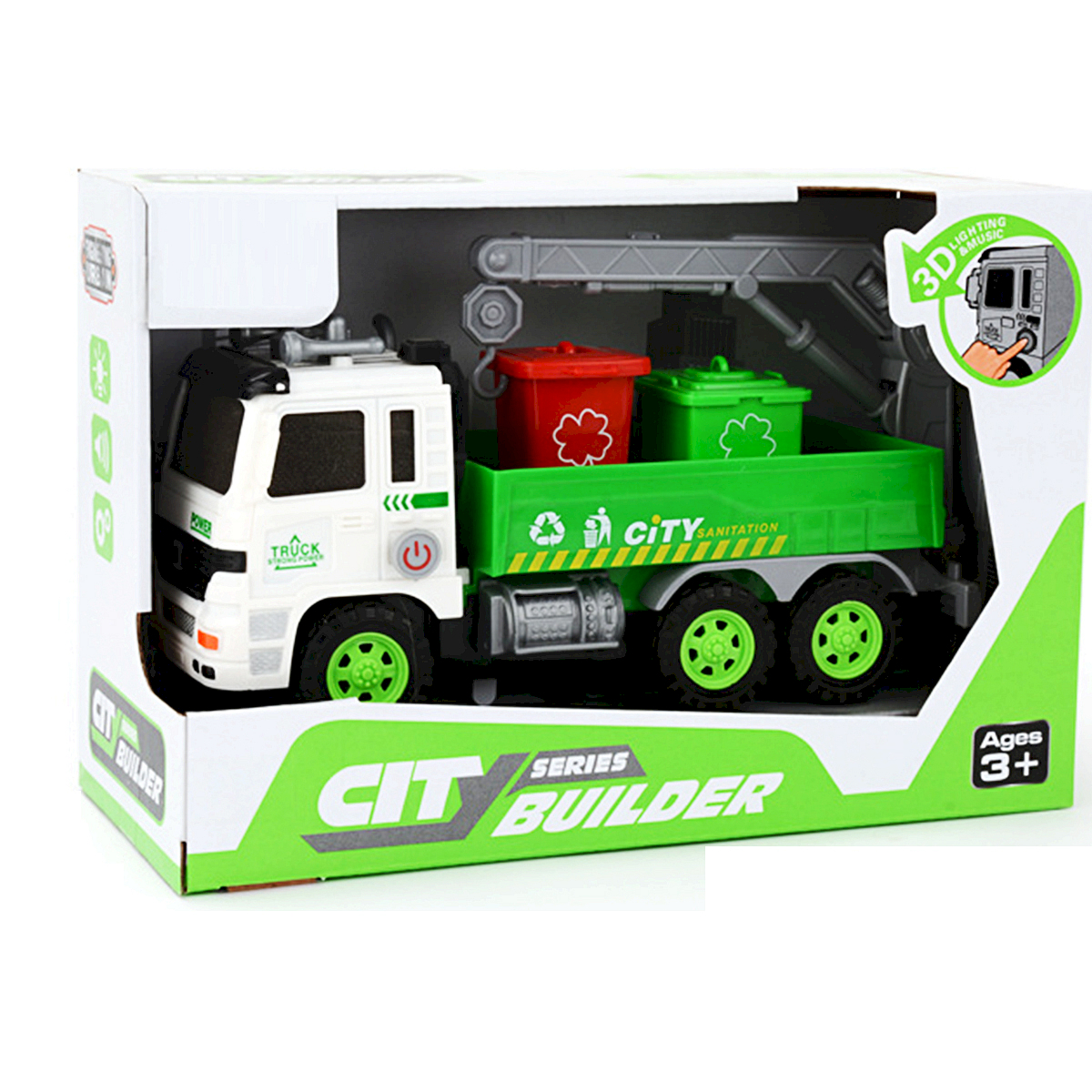 Śmieciarka z żurawiem posiada interaktywne funkcje zabawy: światło oraz dźwięk. Na obudowie kabiny znajduje się przycisk uruchamiający opisane funkcje.Śmieciarka posiada ruchomy żuraw do ponoszenia pojemników na śmieci. Dwa pojemniki na śmieci, w kolorach czerwonym i zielonym, zostały dołączone...