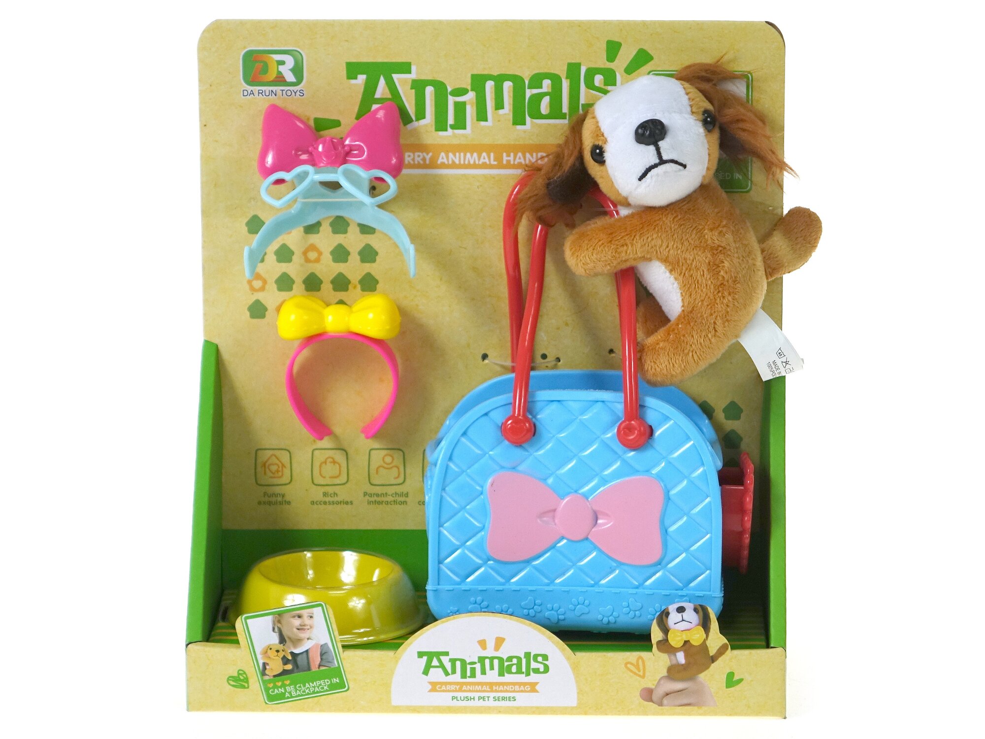 Sada - plyšový pes 12x9x5cm, s taškou a příslušenstvím; 24x21,5x18,5cm,