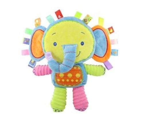 Pluszak (35 cm) ma wszystą w brzuszku grzchotkę i piszczek, a żywe kolory i różnorodność faktur tkaniny dostarczają maluchowi optymalną ilość wrażeń dotykowych.
