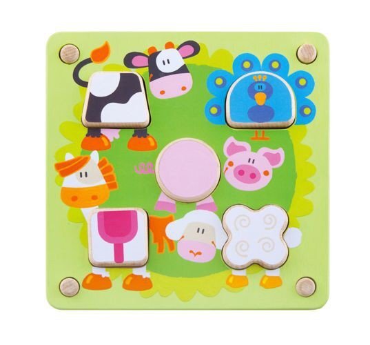 Sorter kształtów, kostka 2 w 1, układanka farma i zwierzątka. Zawiera klocki drewniane, dwustronną planszę oraz pudełko, całość wykonana z drewna.Wymiary: 18 x 6 x 18 cm przeczytaj całość