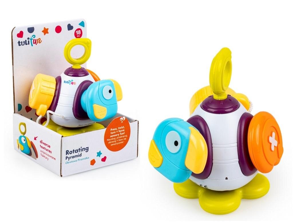 Praktyczna zabawka w kompaktowym rozmiarze zapewni maluchowi zręcznościową rozrywkę, niezależnie od miejsca, w którym się znajduje. Na każdej ze ścianek piramidki kryje się inne zadanie do wykonania: obrotowy element, piszczący ptaszek do naciskania, wtyczka do dopasowania w otwory i wciskania,...