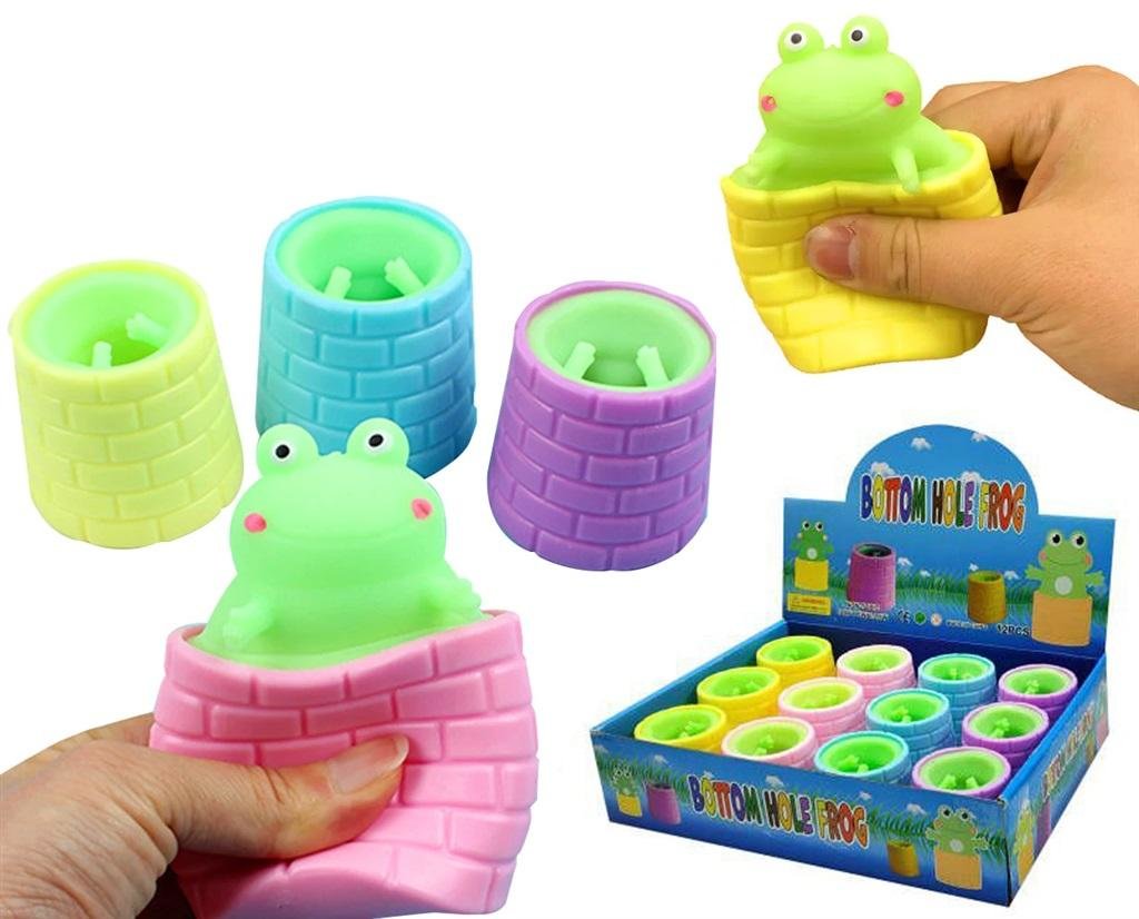 Gumowy gniotek żabka w studni. Po ściśnięciu gumowej studni z jej wnętrza wyskakuje żabka. przeczytaj całość