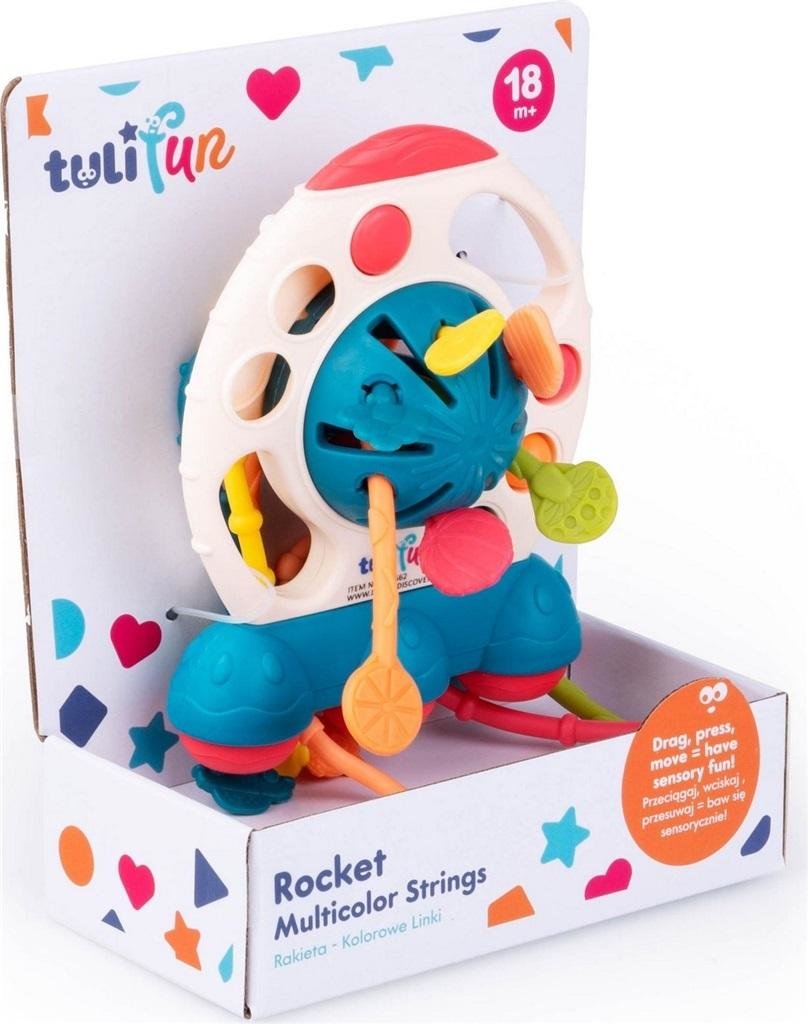 Kosmiczna zabawka wyposażona w wiele ruchomych elementów, takich jak kolorowe kropeczki do wciskania i linki do przeciągania. Wykonując te precyzyjne czynności, dziecko gimnastykuje paluszki, ćwicząc tym samym motorykę małą. Elastyczne linki zdobią zróżnicowane wypustki i symbole owoców oraz pojazdów. Praktyczne otwory umieszczone w rakiecie ułatwią maluchom chwytanie i przenoszenie zabawki.