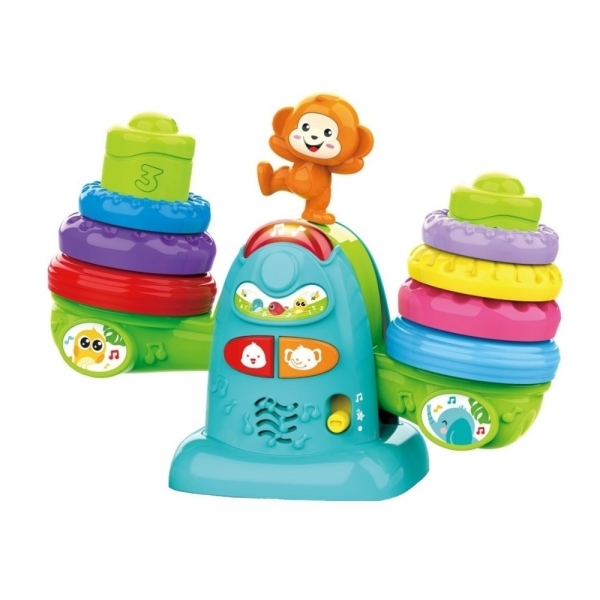 Balanční hra Váha učí batolata čísla, barvy a rovnováhu tím, že naskládá na obě strany houpačky barevné kroužky různých velikostí se zvukovými a světelnými efekty.
