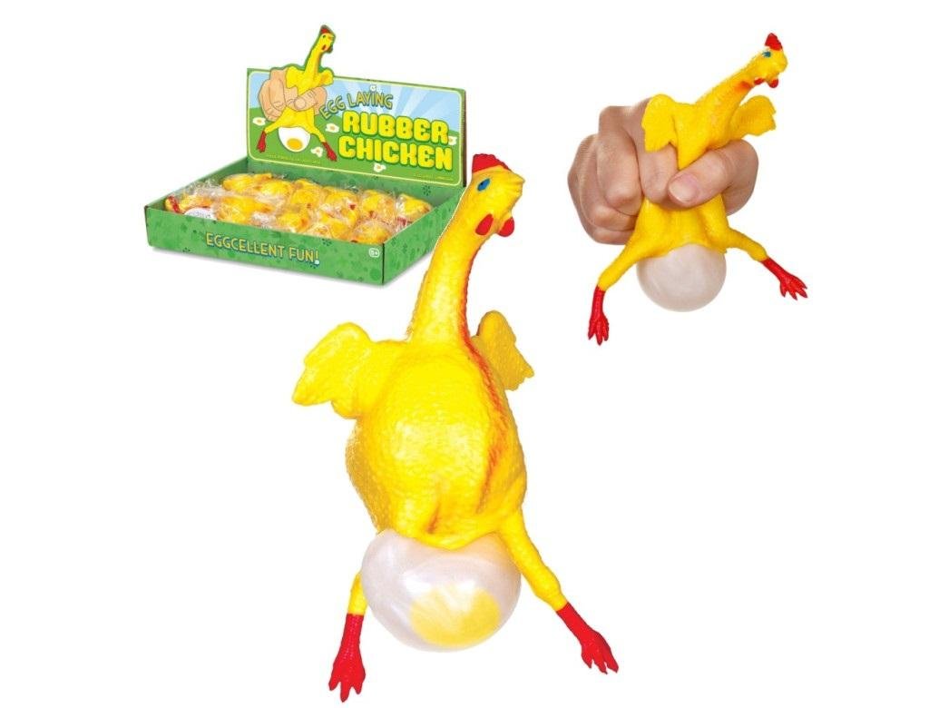 Zabawka wykonana z wysokiej jakości gumy, która po naciśnięciu zawsze wraca w nienaruszonym stanie do swojego pierwotnego kształtu. Wewnątrz kury znajduje się jajko, które pod wpływem nacisku na zabawkę wypełnia się powietrzem i zostaje wypchnięte na zewnątrz. Jest ono umieszczone w tylnej części zabawki, dlatego całość wygląda bardzo naturalnie. Kura znosi jajko, na którym widnieje podobizna żółtka oraz białka. Zabawka wielkości 17cm.
