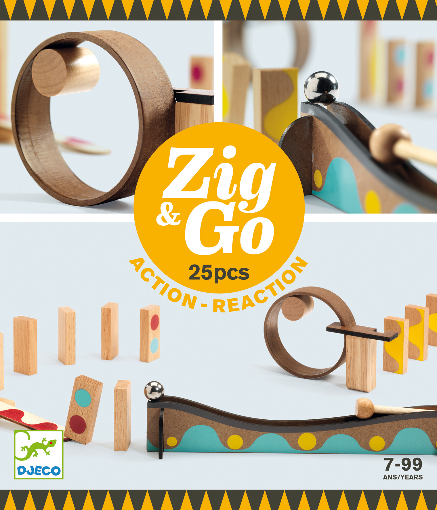 Akční sada dřívek, houpaček a koleček pro sestavení dráhy tak, aby se rozpohybovala. Zapojte své dovednosti a zručnost a použijte přemísťování váhy v závislosti na pohybu a vzdálenosti jednotlivých komponentů. Zazní cílový zvonek? Řetězová reakce může začít. Velikost dráhy se mění v závislosti na množství použitých komponentů.