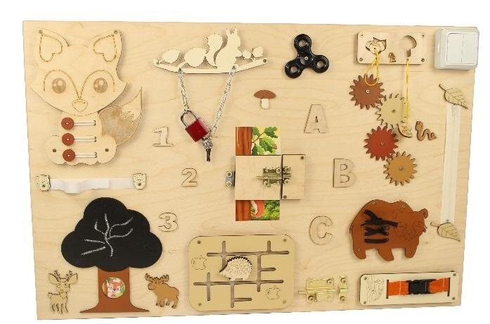 Tablica manipulacyjna duża LasWyposażenie: kolorowe zębatki ruchomenauka zapinania suwakaspinerdwa rodzaje zasuwekniedźwiedź ze sznurówką (nauka wiązania)drewniane cyferkidrewniane literkirzeplabirynt z jeżykiemtablica w...