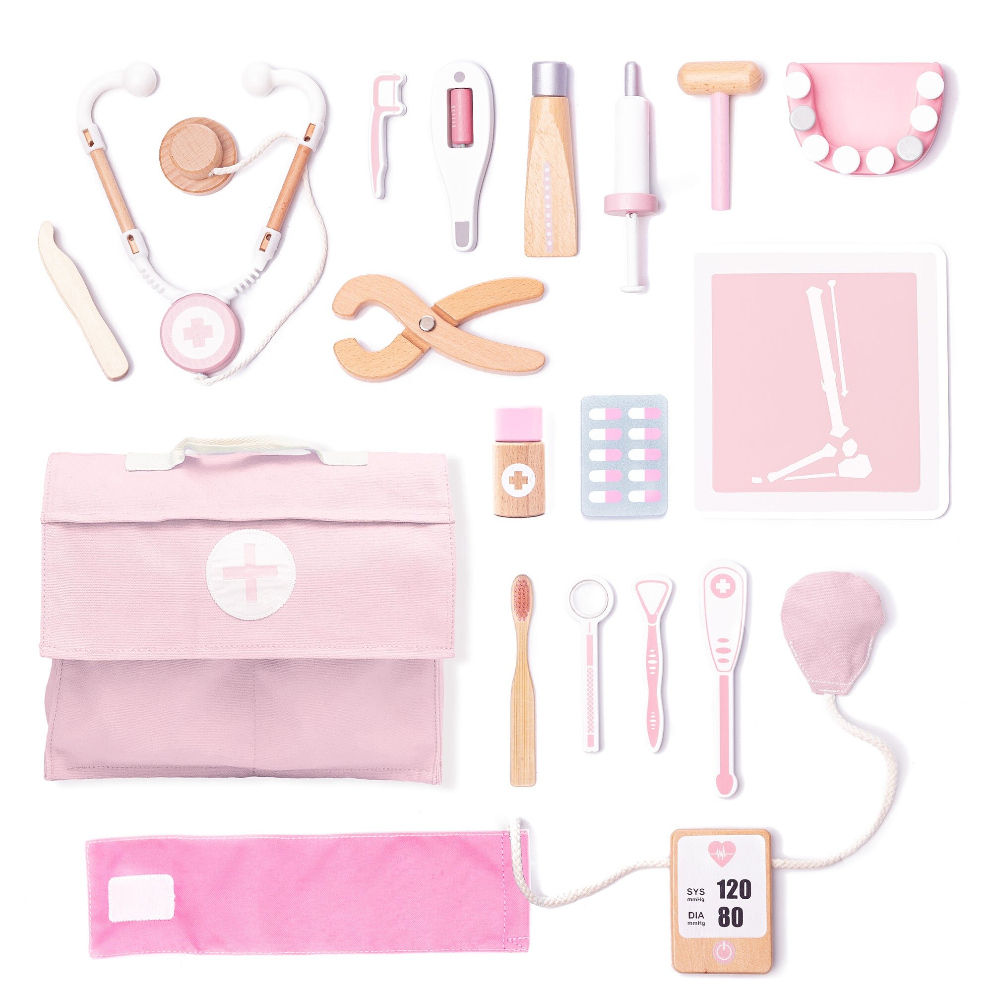 UMU® Doktorská sada pro děti 18 ks - Doktorský kufřík, Dřevěná hračka Růžová