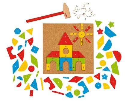 Zestaw do tworzenia kształtów z kolorowych figur. Za pomocą młotka należy przybijać je do korkowej planszy, a powstaną obrazki, jakie tylko podpowie wyobraźnia. Zestaw zawiera 118 elementów. Opakowanie zawiera: planszę korkową, różnokolorowe drewniane elementy z dziurkami, metalowe pinezki do... przeczytaj całość