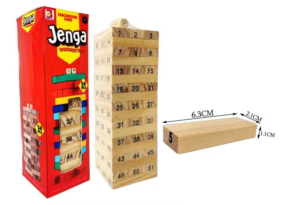 Věž dřevěná s čísly. 54 dílků. Rozměry poskládané věže 6,3x6,3x20 cm, jednoho dílku 6,3x2,1x1,1 cm. przeczytaj całość
