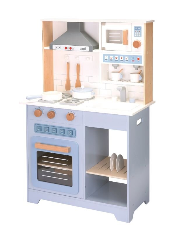Dřevěná kuchyňka s vybavením.Kuchyň je laděna do bílé a šedé/modré barvy, vyrobena ze dřeva a MDF. Hračka poskytuje vše, co mladý kuchař potřebuje. Kuchyně má mnoho funkcí:trouba s otevíráním, průhledná dvířka - nelakovaná, dvířka mají průhledné sklo (z bezpečného materiálu), jako u skutečné...