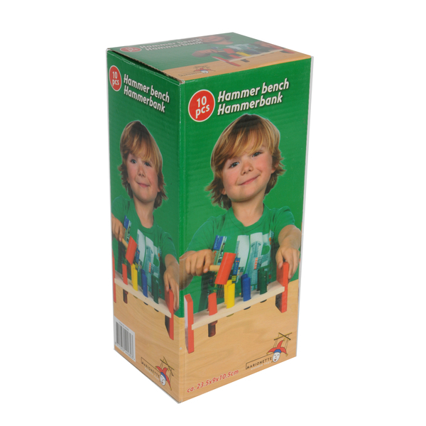 Dřevěný herní set kladívko s poličkou a kolíčky (10 ks)Pomocí dřevěného kladívka děti zatloukají 8 špalíčků různých barev. Po zatlučení všech špalků se polička obrátí a dítě může začít znovu - cvičí si tak svou motoriku, manuální zručnost, přesnost, fantazii a obratnost.Rozměry: 23,5 x 9 x 10,5...