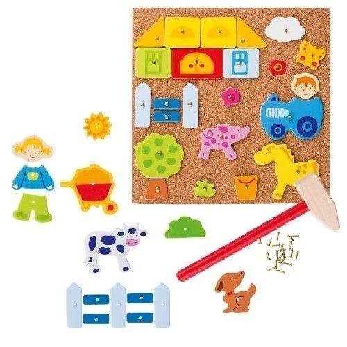Opakowanie zawiera: planszę korkową, różnokolorowe drewniane elementy z dziurkami, metalowe pinezki do przybijania, drewniany młotek oraz kartę z wzorami.Wymiary planszy: 19 x 19 cmProdukt dopuszczony do obrotu w UE zgodnie z posiadanym certyfikatem CE oraz zgodnością z normą EN-71. przeczytaj całość