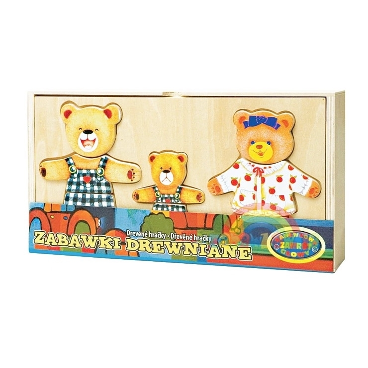 Obleč medvídka. V praktické dřevěné krabičce jsou různé dřevěné oblečení na vkládání. przeczytaj całość
