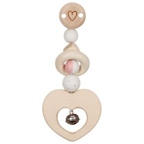 Krásný dřevěný klip s motivem srdce a rolničkou, vydávající příjemný zvuk, zaujme všechna malá aktivní miminka.Klip slouží jako praktická šňůrka na uvázání dudlíku. Nejen, že klip chrání dudlík před jeho padáním, ztrátou a ušpiněním, ale zároveň slouží jako ideální hračka pro rozvoj smyslů...