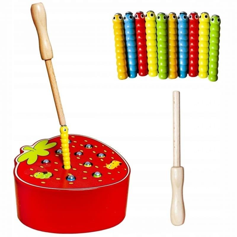 GRA DREWNIANA - TRUSKAWKA - ZŁAP ROBACZKAZasady gry nie są zbyt skomplikowane i polegają na zapełnieniu owocutruskawki 10 robaczkami. W następnej kolejności dajemy dziecku które przyużyciu pałeczki z magnesem, wyciąga robaczki i w ten sposób pozbywamy sięszkodników z owocu.Gra pomaga rozpoznawać...