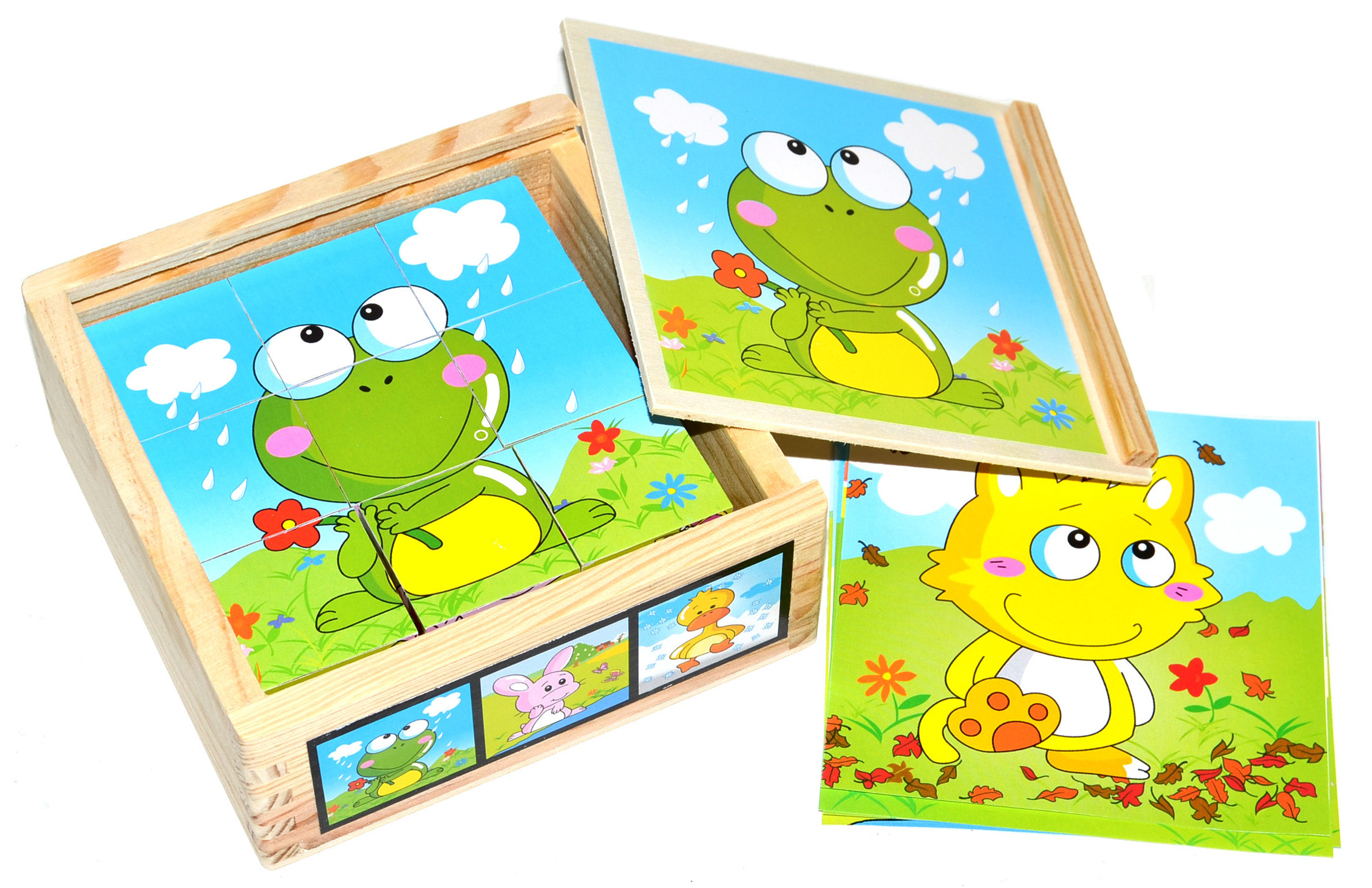 Obrázkové kostky v dřevěné krabičce se zasunovacím víkem. Krabička obsahuje 9 ks dřevěných kostek, z nichž je možné sestavit 6 různých obrázků, postavit třeba komín, hrad nebo ohradu pro zvířátka. Rozvíjí logické myšlení, prostorové vnímání a předsta przeczytaj całość