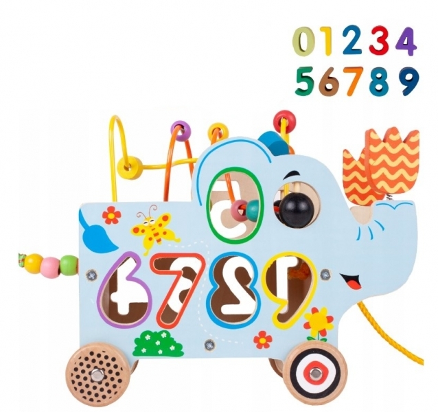 Edukační dřevěný slon s kolečky, labyrintem a čísly