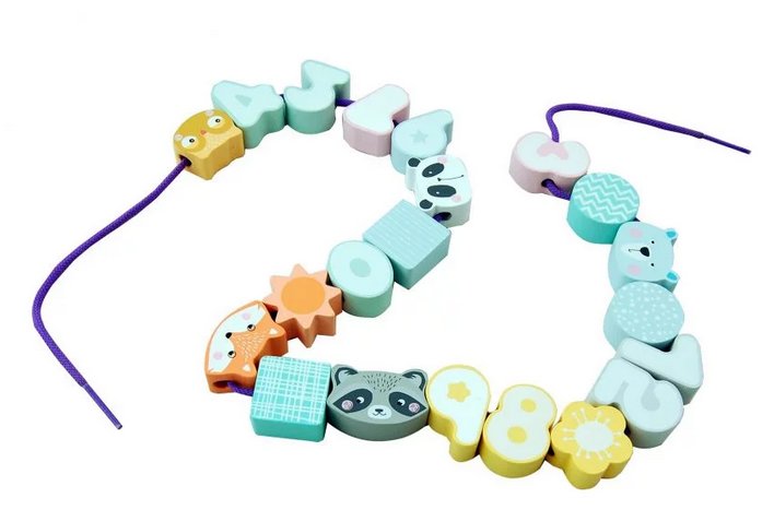 Hračka tvaruje koordinaci rukou a očí. Sada obsahuje 22 prvků: korálky se zvířaty: medvídek, panda, sova, liška a mýval korálky s čísly od 0 do 9 korálky s tvarem: dva čtverce, dva kruhy (každý v jiné barvě a s odlišným... przeczytaj całość