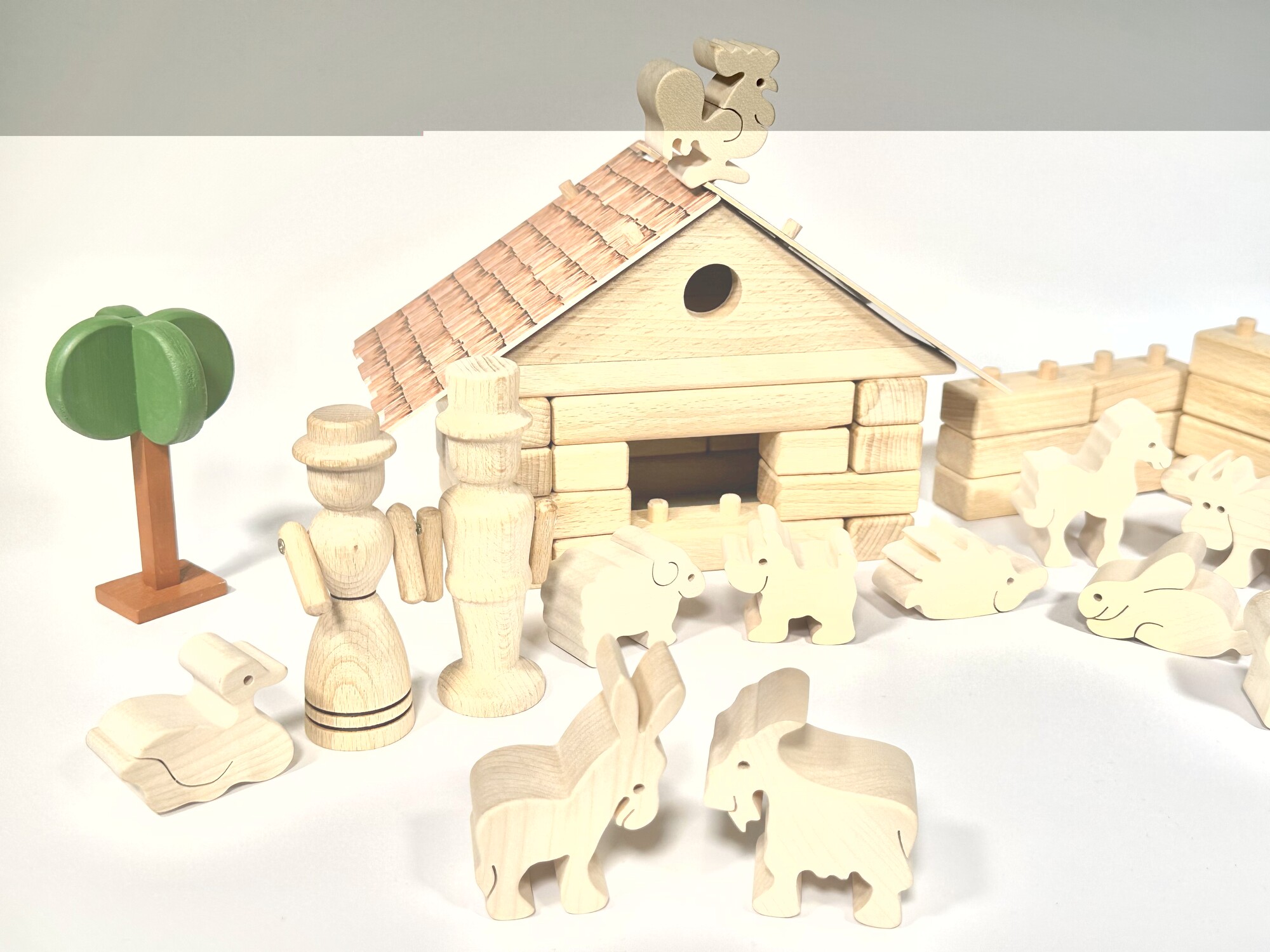 Tento dřevěný herní set seznamuje děti se životem na farmě. Je vyroben v České republice z kvalitního dřeva. Obsahuje dílky s kolíčky/výstupky, se kterými děti postaví snadno a rychle chaloupku. Výstupky na dílcích zajistí, že chaloupka nepadá a děti si užijí klidné stavění bez rozčilování. Pak...