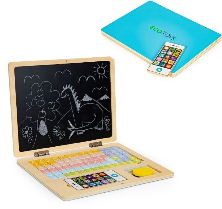 ECOTOYS Dřevěný notebook s magnetickým monitorem - modrý