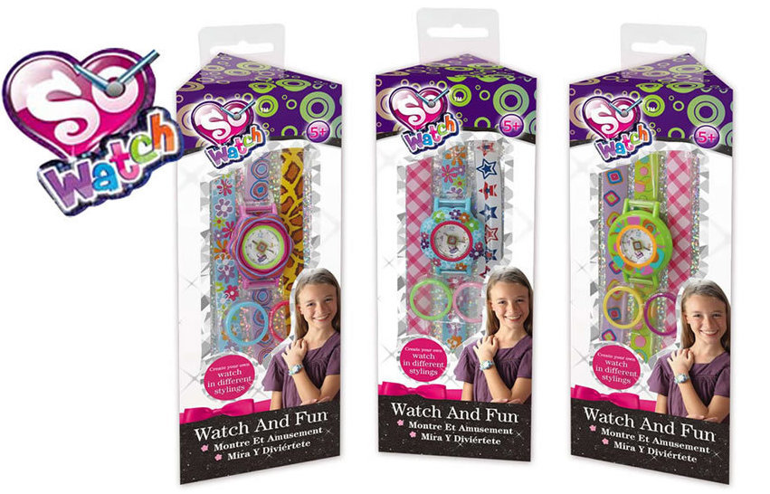 Barevné holčičí hodinky. Určené pro dívky od pěti let. Na výběr je ze tří různých balení. V každém balení jsou různé komponenty na obměnu vzhledu a stylu hodinek. Například třikrát jiný pásek k hodinkám, nebo několik barevných proužků na display hodinek. Hodinky slouží jako krásný doplněk k oblečení a mají praktickou funkci, že se dítě učí a procvičuje si čas.
