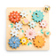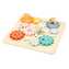 Zabawka motoryczna dla dociekliwych dzieci od 2 lat. Dzieci najpierw umieszczają zębate kółka w otworach na drewnianej planszy tak, aby się zazębiały. Na kółka nakładają potem elementy ze zwierzątkami. Poprawne ułożenie kółek sprawia, że cała seria wprawiana jest w ruch. Wszystko obraca się jak na karuzeli, towarzyszy temu urzekające wirowanie wzorów i kolorów.